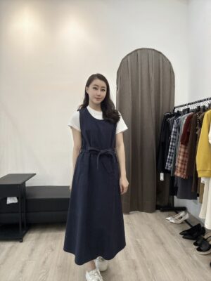 • M15 圓領大口袋綁帶無袖長洋裝